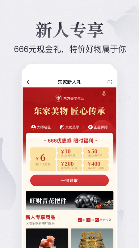 东家APP是致力于高品质、高格调东方美物直购平台,致力于让传承成为潮流,让东方美学融入家庭生活,以电商拍卖、产业聚合、匠艺创新等形式,深耕数十个产业类目,产品涵盖了茶叶、茶器、首饰、文玩、家居、食味、服饰7大工艺美术类目,真选名匠好物,尤其在茶叶茶器、玉石翡翠、文玩家居等类目中,东家已成为品质优、选择多的平台。