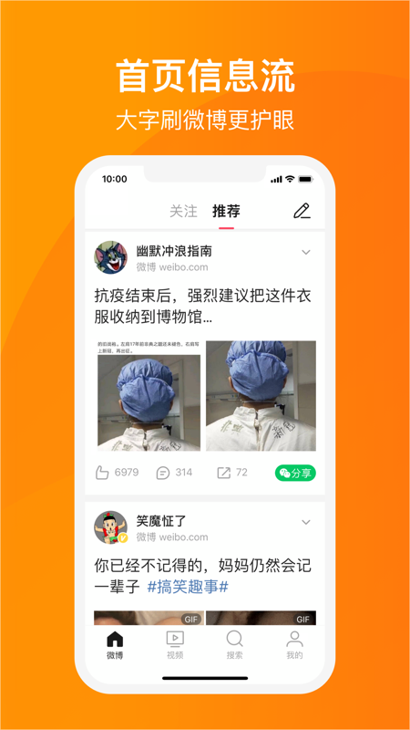 微博大字版,一般又称WeiboBig。微博大字版,字体放大更护眼,功能简洁易操作,支持辅助工具读屏。打开微博大字版,随时随地发现新鲜事!