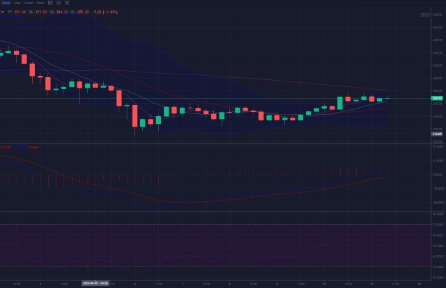 以太坊昨日早盘触及最高目标377,价格开始缓慢下降。在早盘低点数次试探360一线支撑力度后,大盘迎来反弹。目前价格在368附近,短期有上涨趋势。