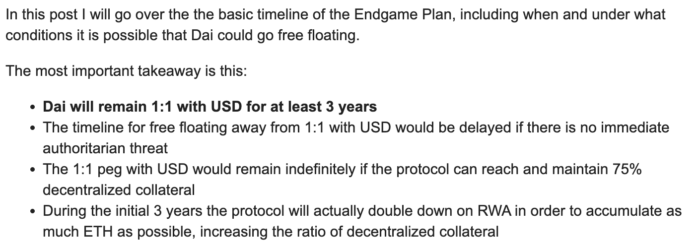 Rune 8 月 30 日发表在 MakerDAO 治理论坛中的终局计划时间表也显示 DAI 将在至少 3 年时间里保持与美元的锚定,若没有遭到直接威胁,这一时间还将延长。如果能够将抵押品的去中心化程度提高到 75%,那么将无期限的保持与美元的锚定。