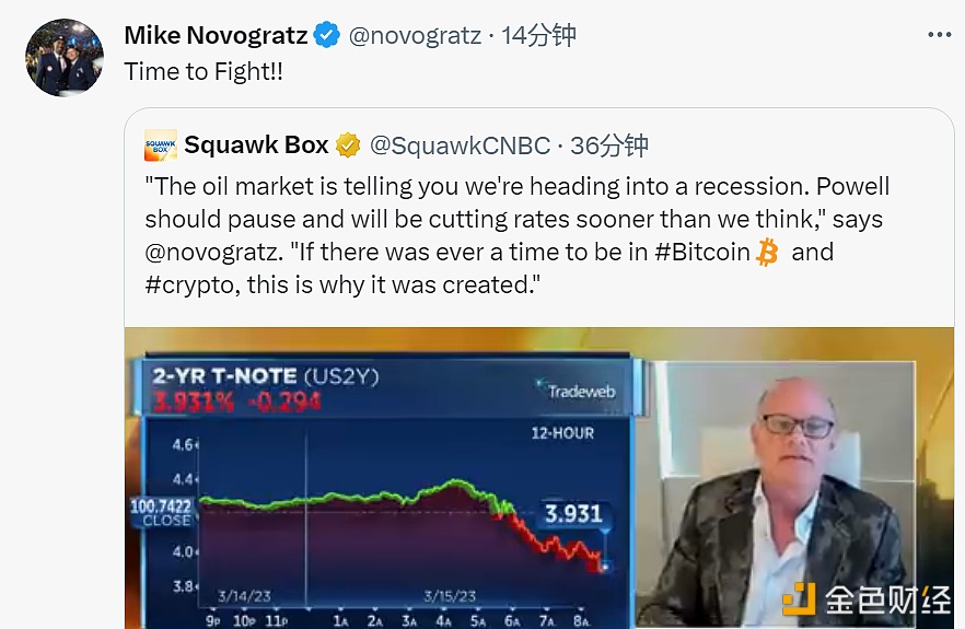 加密货币投资公司Galaxy Digital创始人Mike Novogratz今日接受CNBC财经栏目Squawk Box采访时表示,原油市场表现已经告诉市场正在进入萧条阶段,杰罗姆·鲍威尔(美联储主席)应该立即暂停升息,然后以比我们想象更快的速度降低利率。现在是时候关注比特币和加密货币,这也是为什么比特币和加密货币被创造出来的原因。