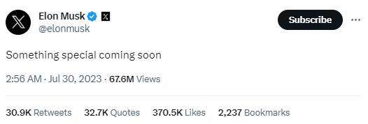 7月30日,推特将其经典小蓝鸟logo更改为“X”后,马斯克再次在社交主页上发帖,预告“有些特别的事即将到来”。尽管马斯克尚未解释此话的深意,但该消息的评论区迅速被加密货币投资者涌入,纷纷用DOGE和SHIB相关的图文“攻陷”。