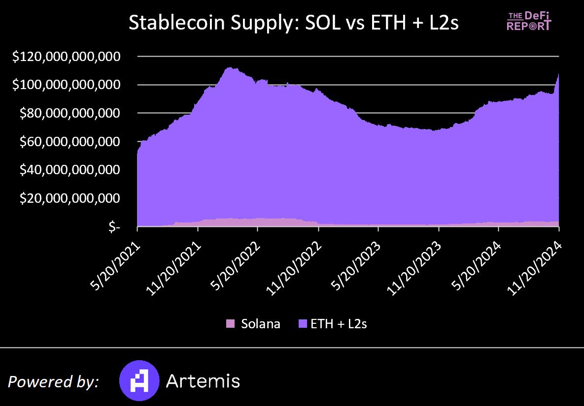 2024 年 7 月,Solana 的稳定币供应量约为 31 亿美元,约占以太坊和 L2s 稳定币供应量的 3.5%。