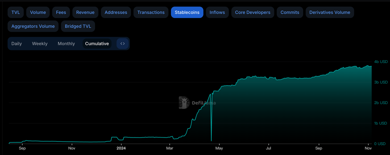 从图-7中我们可以看出Base链上的稳定币在今年3月份开始至今一直呈快速增长的态势,其在2024年3月时Base链上的稳定币为3.19亿美元,截止到现在的周交易量为37.71亿美元,我们可以计算出,Base链上的稳定币数量在3-10月中总计增幅达到了1082.13%,月平均增幅达到了216.42%,可以看出来Base链上的稳定币数量一直保持快速且持续的增长。